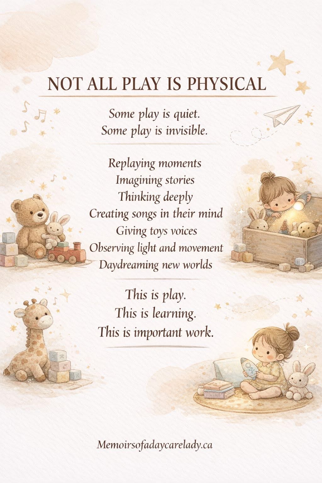 An infant and toddlers job and how they learn the most is through play. Play is learning; it is the work of childhood! Play builds attention spans, language and problem solving, emotional regulation, and lifelong learning.
